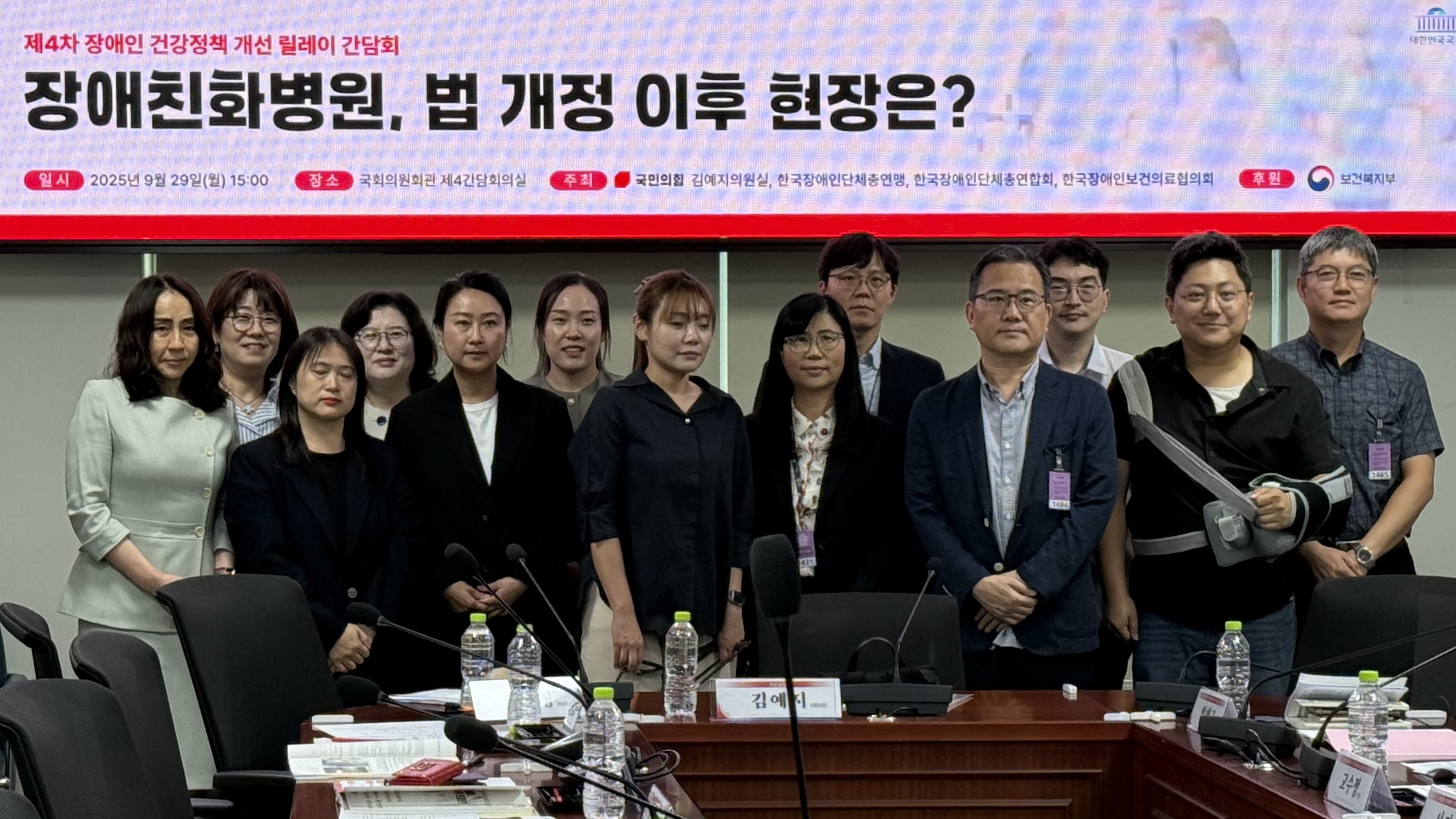 ![]() ![]() ![]() ![]() 제4차 장애인 건강정책 개선 릴레이 간담회 "장애친화병원, 법 개정 이후 현장은?" 일시: 2025년 09월 29일 오후 1시 ~ 오후 3시 30분 장소: 국회의원회관 제4간담회의실 주최: 김예지 의원실, 한국장애인보건의료협의회, 한국장애인단체총연맹, 한국장애인단체총연합회 |