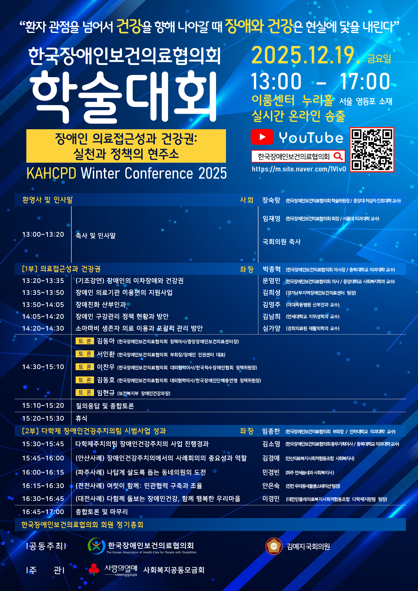 > 공지 및 행사 > 공지사항| 2025년 동계 학술대회 <장애인 의료접근성과 건강권:실천과 정책의 현주소> 개최 안내 By 관리자 / 2025-11-12 PM 03:57 / 조회 : 116회 |