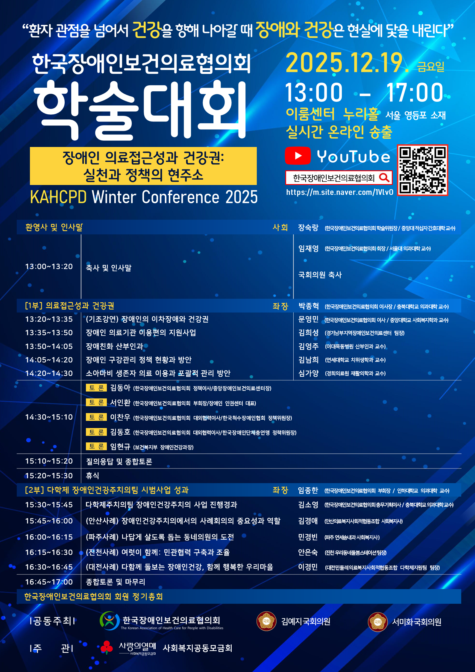 안녕하십니까, 사단법인 한국장애인보건의료협의회 사무국입니다. 한국장애인보건의료협의회는 장애인의 건강하고 행복한 삶에 이바지하는 것을 목표로 장애인 건강 관련 제도 및 근거 마련에 기여하고자 모든 장애유형의 분야별 전문가 및 장애인 당사자로 조직을 구성한 '국내 유일의 다학제적 전문조직'입니다. 다가오는 2025년 12월 19일(금) 오후 1시, 「장애인 의료접근성과 건강권:실천과 정책의 현주소」을 주제로 국회, 정부, 장애인 당사자, 학계 및 유관기관과의 열린 논의의 장을 마련하고자 아래와 같이 학술대회를 개최합니다. 학술대회에 참가를 원하시는 회원, 유관기관/단체는 참가신청서를 작성해주시기 바라며, 이번 학술대회에 적극 참여하시어 학술대회가 성황리에 개최될 수 있도록 협조해 주시기를 부탁드립니다. 기타 문의사항은 협의회 사무국 (T.043-262-9833) 으로 연락 주시기 바랍니다. 감사합니다. |