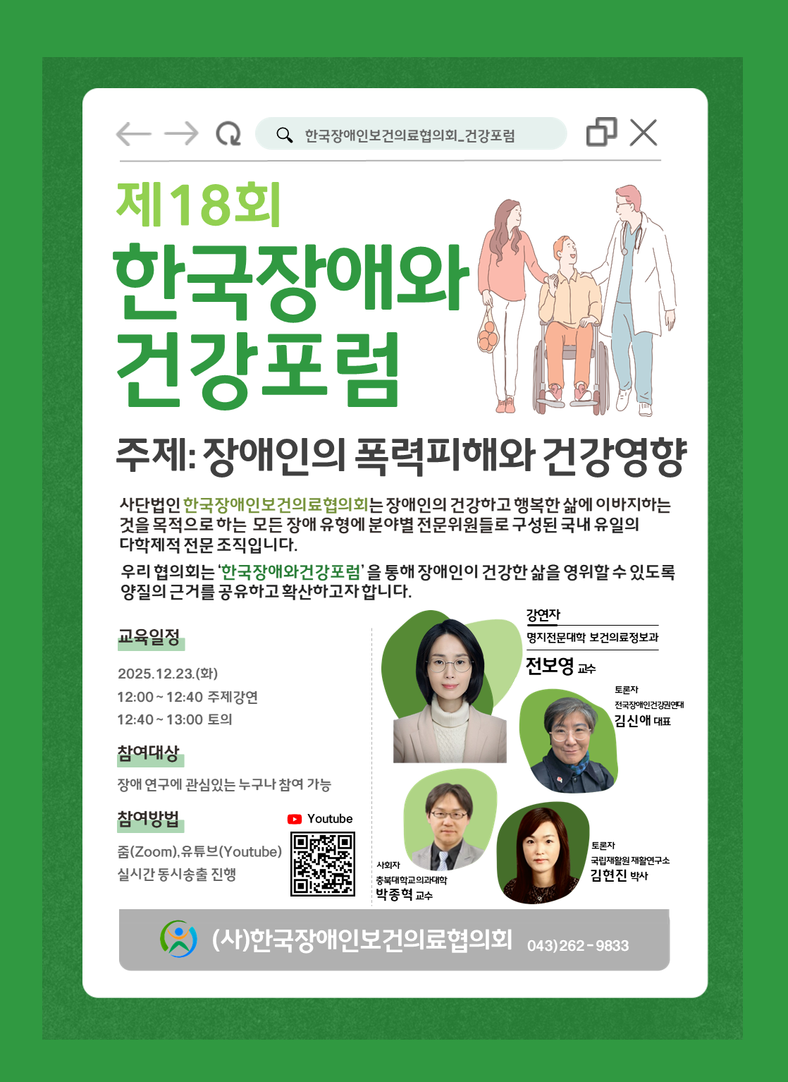 안녕하십니까. 한국장애인보건의료협의회 사무국입니다. 저희 협의회는 장애인이 건강한 삶을 영위할 수 있도록 양질의 근거들을 확산시키고자‘한국장애와건강포럼'을 개최하고자 합니다. 해당 포럼은 줌(zoom)과 한국장애인보건의료협의회 공식 유튜브 채널을 통하여 비대면 온라인 생중계로 진행될 예정이오니 많은 관심과 참여 부탁드립니다. * 줌(Zoom): 주제: 장애인의 폭력피해와 건강영향 시간: 2025년 12월 23일 (화) 오후 12:00 [링크] 한국장애와건강포럼 참여하기 ☜ 클릭하면 줌 회의로 접속 회의 ID: 817 0676 2873 암호: 121439 * 한국장애인보건의료협의회 공식 유튜브 채널: [유튜브] 한국장애인보건의료협의회 공식 채널 ☜ 클릭하여 방문 |