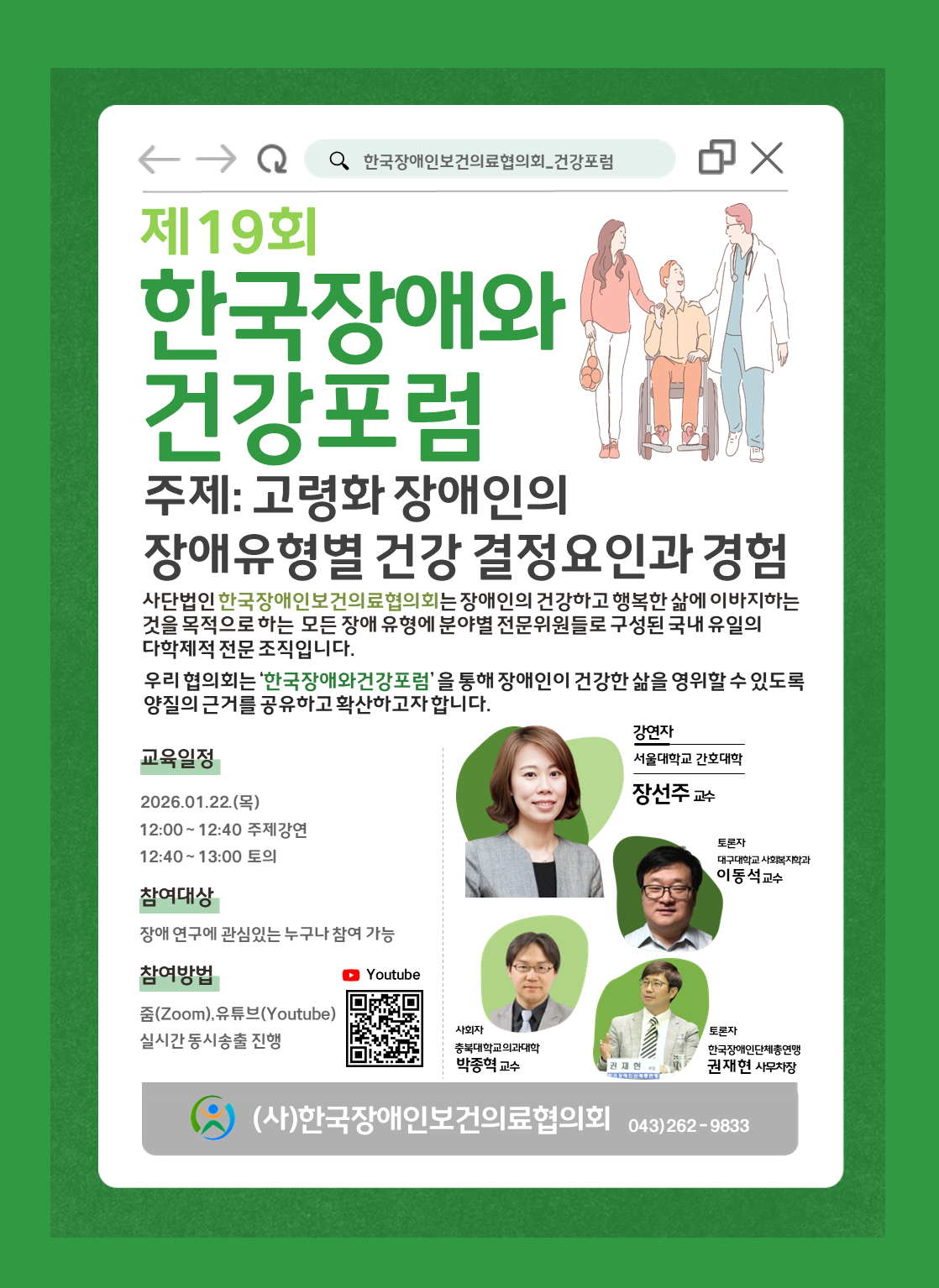안녕하십니까. 한국장애인보건의료협의회 사무국입니다. 저희 협의회는 장애인이 건강한 삶을 영위할 수 있도록 양질의 근거들을 확산시키고자‘한국장애와건강포럼'을 개최하고자 합니다. 해당 포럼은 줌(zoom)과 한국장애인보건의료협의회 공식 유튜브 채널을 통하여 비대면 온라인 생중계로 진행될 예정이오니 많은 관심과 참여 부탁드립니다. * 줌(Zoom): 주제: 고령화 장애인의 장애유형별 건강 결정요인과 경험 시간: 2026년 1월 22일 (목) 오후 12:00 [링크] 한국장애와건강포럼 참여하기 ☜ 클릭하면 줌 회의로 접속 회의 ID: 859 1875 1258 암호: 610474 * 한국장애인보건의료협의회 공식 유튜브 채널: [유튜브] 한국장애인보건의료협의회 공식 채널 ☜ 클릭하여 방문 |