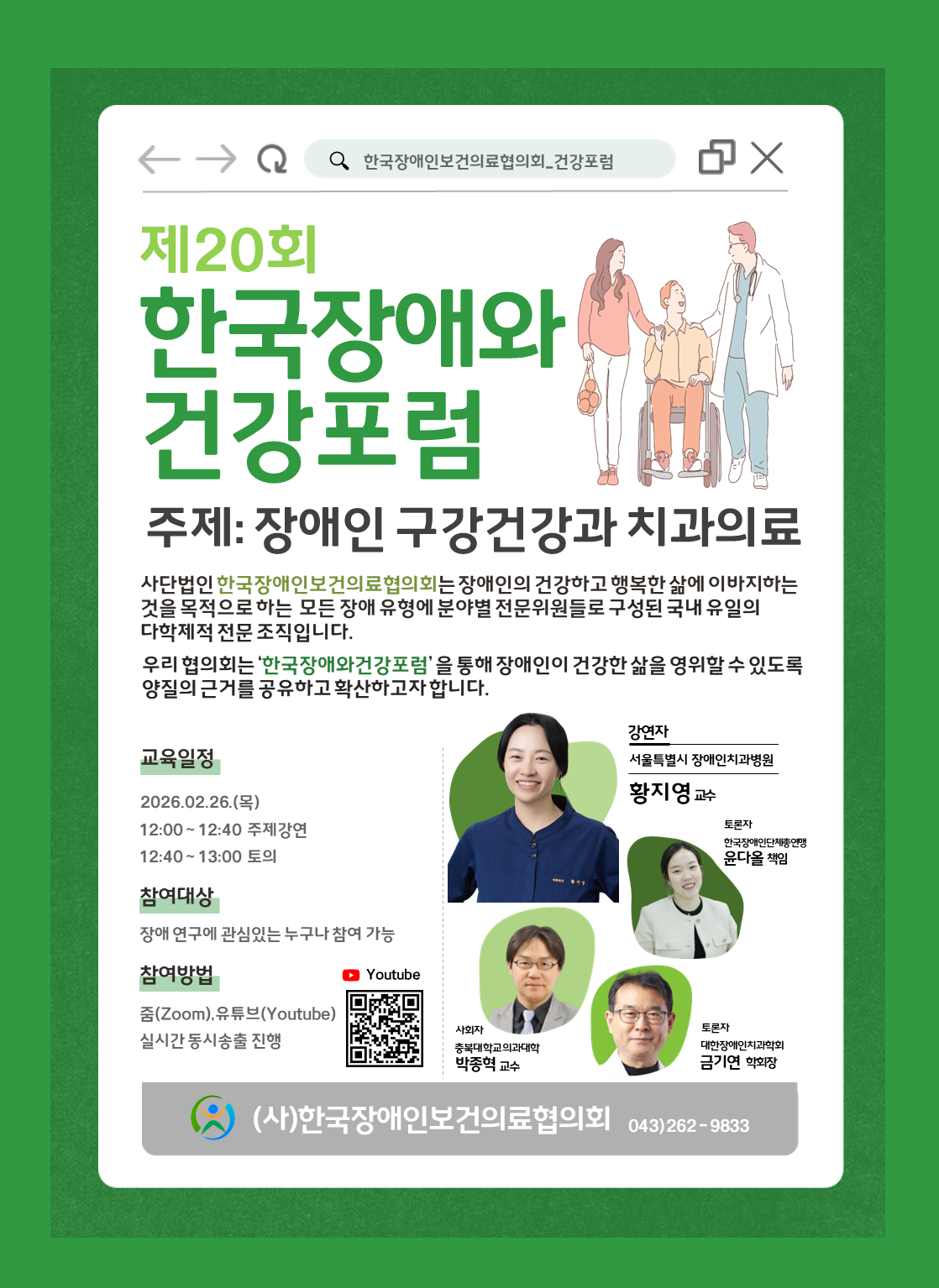 안녕하십니까. 한국장애인보건의료협의회 사무국입니다. 저희 협의회는 장애인이 건강한 삶을 영위할 수 있도록 양질의 근거들을 확산시키고자‘한국장애와건강포럼'을 개최하고자 합니다. 해당 포럼은 줌(zoom)과 한국장애인보건의료협의회 공식 유튜브 채널을 통하여 비대면 온라인 생중계로 진행될 예정이오니 많은 관심과 참여 부탁드립니다. * 줌(Zoom): 주제: 장애인 구강건강과 치과의료 시간: 2026년 2월 26일 (목) 오후 12:00 [링크] 한국장애와건강포럼 참여하기 ☜ 클릭하면 줌 회의로 접속 회의 ID: 822 8379 9306 암호: 477614 * 한국장애인보건의료협의회 공식 유튜브 채널: [유튜브] 한국장애인보건의료협의회 공식 채널 ☜ 클릭하여 방문 |
