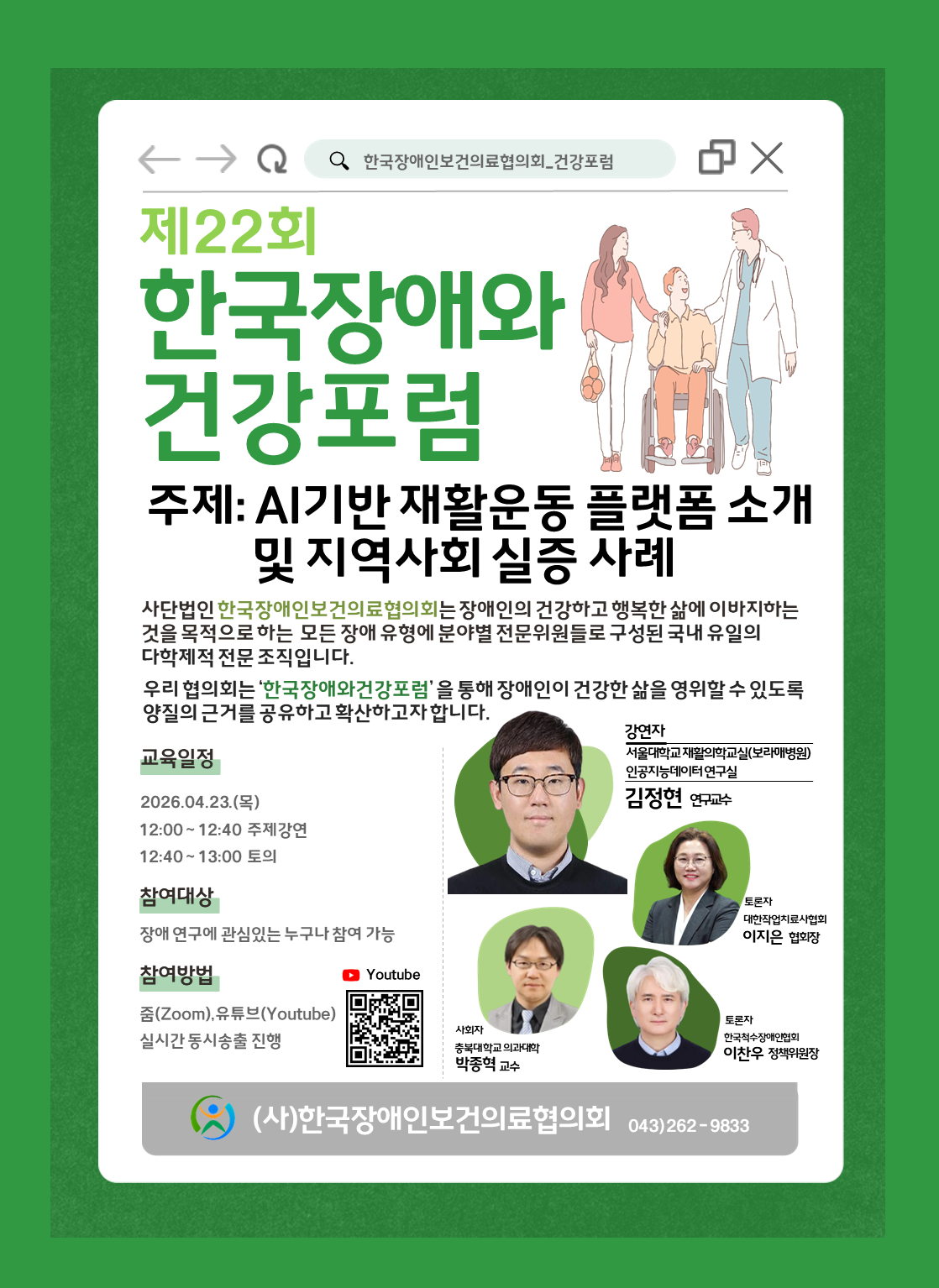 안녕하십니까. 한국장애인보건의료협의회 사무국입니다. 저희 협의회는 장애인이 건강한 삶을 영위할 수 있도록 양질의 근거들을 확산시키고자 ‘한국장애와건강포럼'을 개최하고자 합니다. 해당 포럼은 줌(zoom)과 한국장애인보건의료협의회 공식 유튜브 채널을 통하여 비대면 온라인 생중계로 진행될 예정이오니 많은 관심과 참여 부탁드립니다. * 줌(Zoom): 주제: AI 기반 재활운동 플랫폼 소개 및 지역사회 실증 사례 시간: 2026년 4월 23일 (목) 오후 12:00 [링크] 한국장애와건강포럼 참여하기 ☜ 클릭하면 줌 회의로 접속 회의 ID: 892 8588 2848 암호: 039562 * 한국장애인보건의료협의회 공식 유튜브 채널: [유튜브] 한국장애인보건의료협의회 공식 채널 ☜ 클릭하여 방문 |