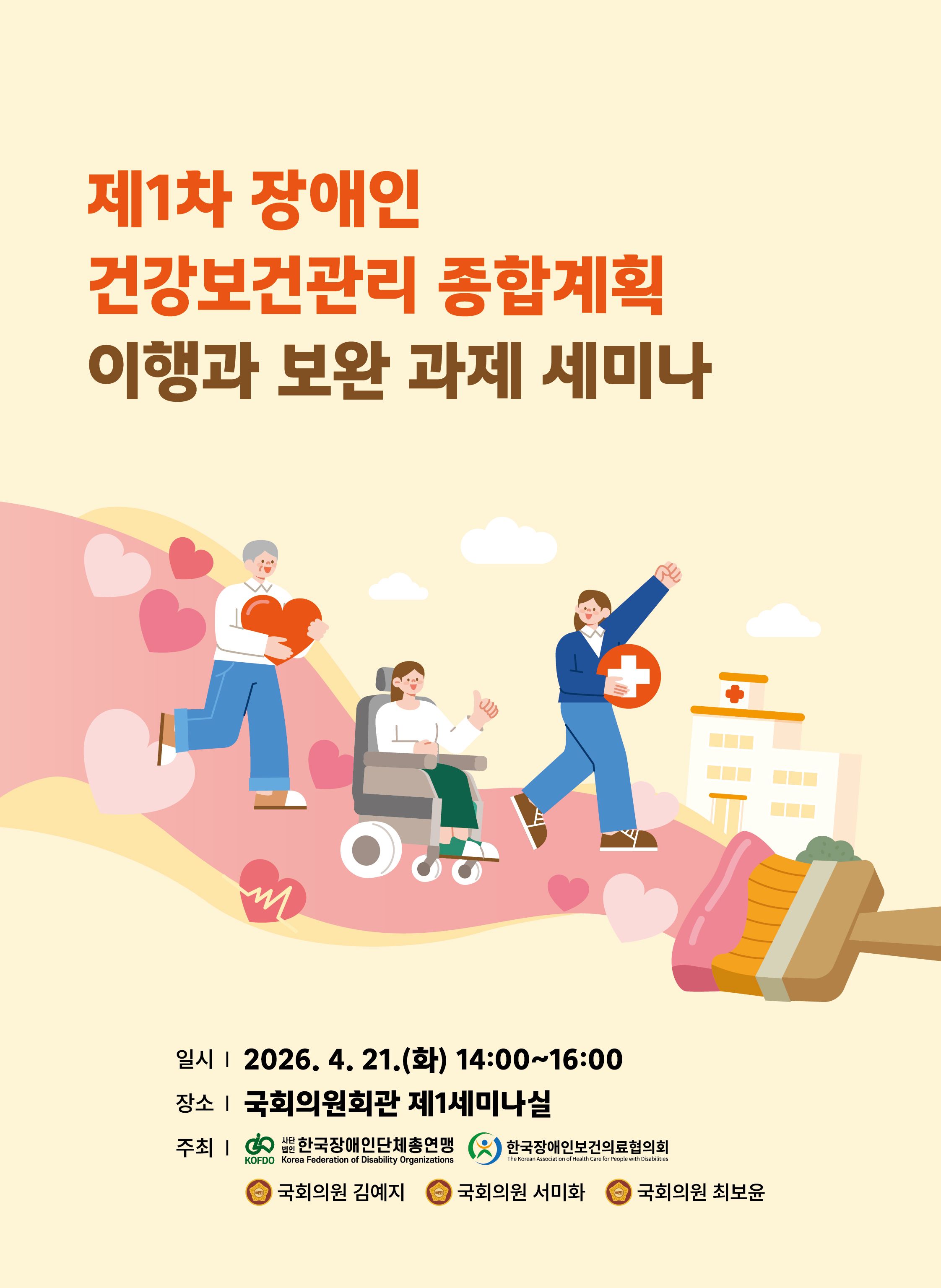 안녕하세요, 한국장애인보건의료협의회 사무국입니다. 한국장애인보건의료협의회는 한국장애인단체총연맹, 김예지 국회의원, 서미화 국회의원, 최보윤 국회의원과 함께 「제1차 장애인 건강보건관리 종합계획 이행과 보완 과제 세미나」를 개최합니다. 이번 세미나는 해당 종합계획의 주요 내용을 함께 살펴보고, 장애인 당사자 중심의 정책 이행을 위해 보완이 필요한 과제들을 논의하고자 마련되었습니다. 아래 행사 개요를 참고하시어 많은 관심과 참석을 부탁드립니다.